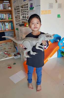 生日當天,爸爸帶他去玩具店挑生日禮物,買了隻大型恐龍。其實早在幾個月前,他就很想要買這隻恐龍,但是怕爸媽生氣,從來沒有說。跟爸爸確認他要什麼都可以買,才敢說出來。我聽了一則以喜、一則以憂,怎麼樣拿捏才是剛剛好,真是大學問。